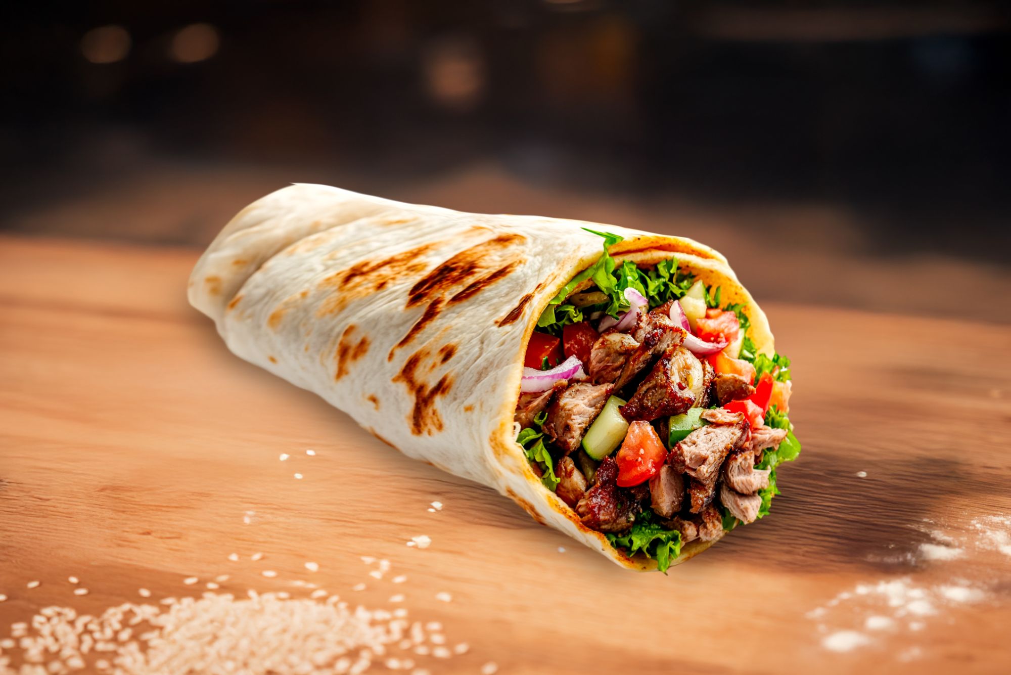 Pšenična tortilja, goveđe i pileće meso (150g), salata, umak