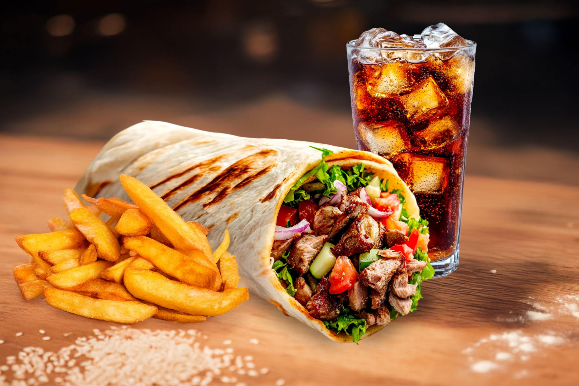 Pšenična tortilja, goveđe meso (150g), salata, umak, pommes frites (100g), piće po izboru