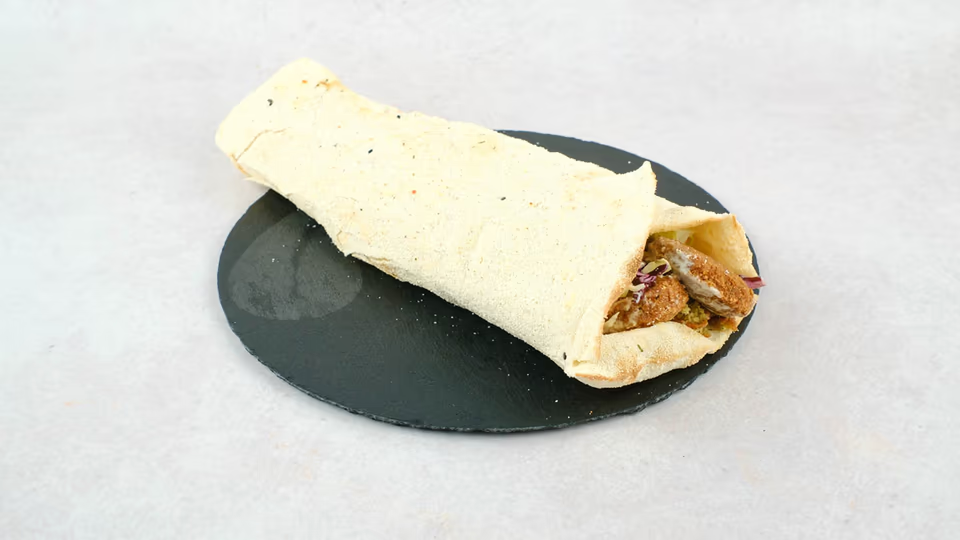 Pšenična tortilja, pileće meso (150g), salata, umak, pommes frites (100g), piće po izboru