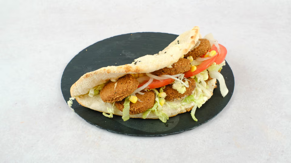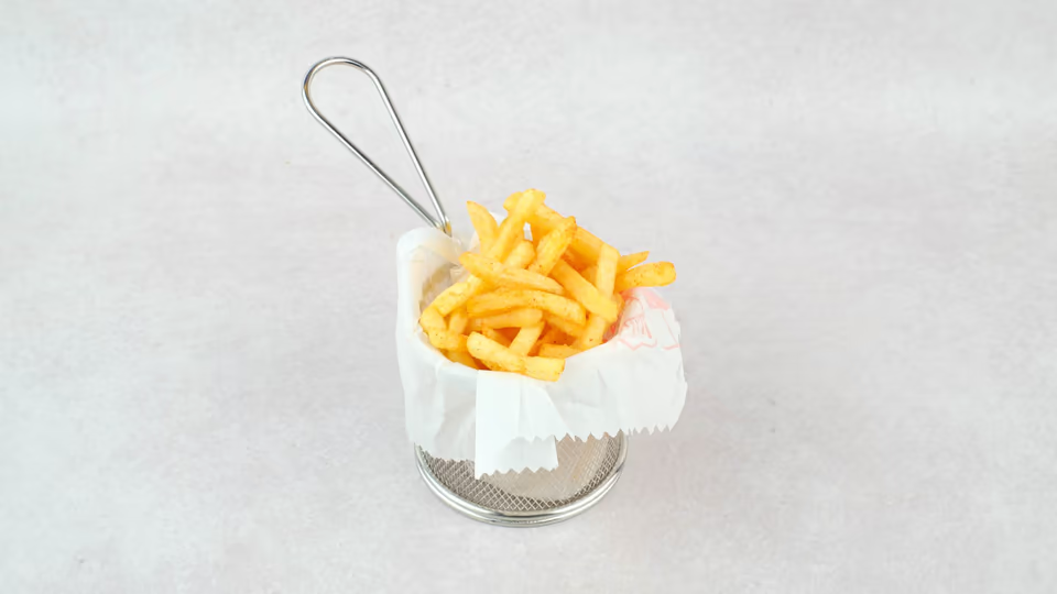 Lepinja, pileće meso (150g), salata, umak, pommes frites (100g), piće po izboru