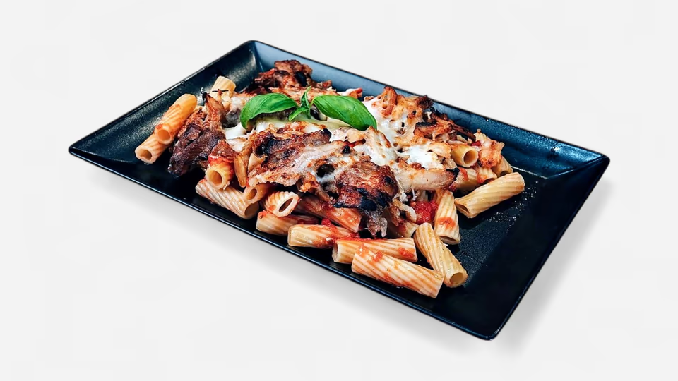 Rigatoni, piletine, domaći umak od rajčice, sir edamer